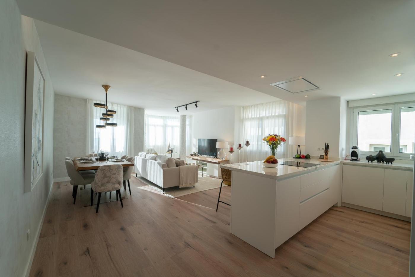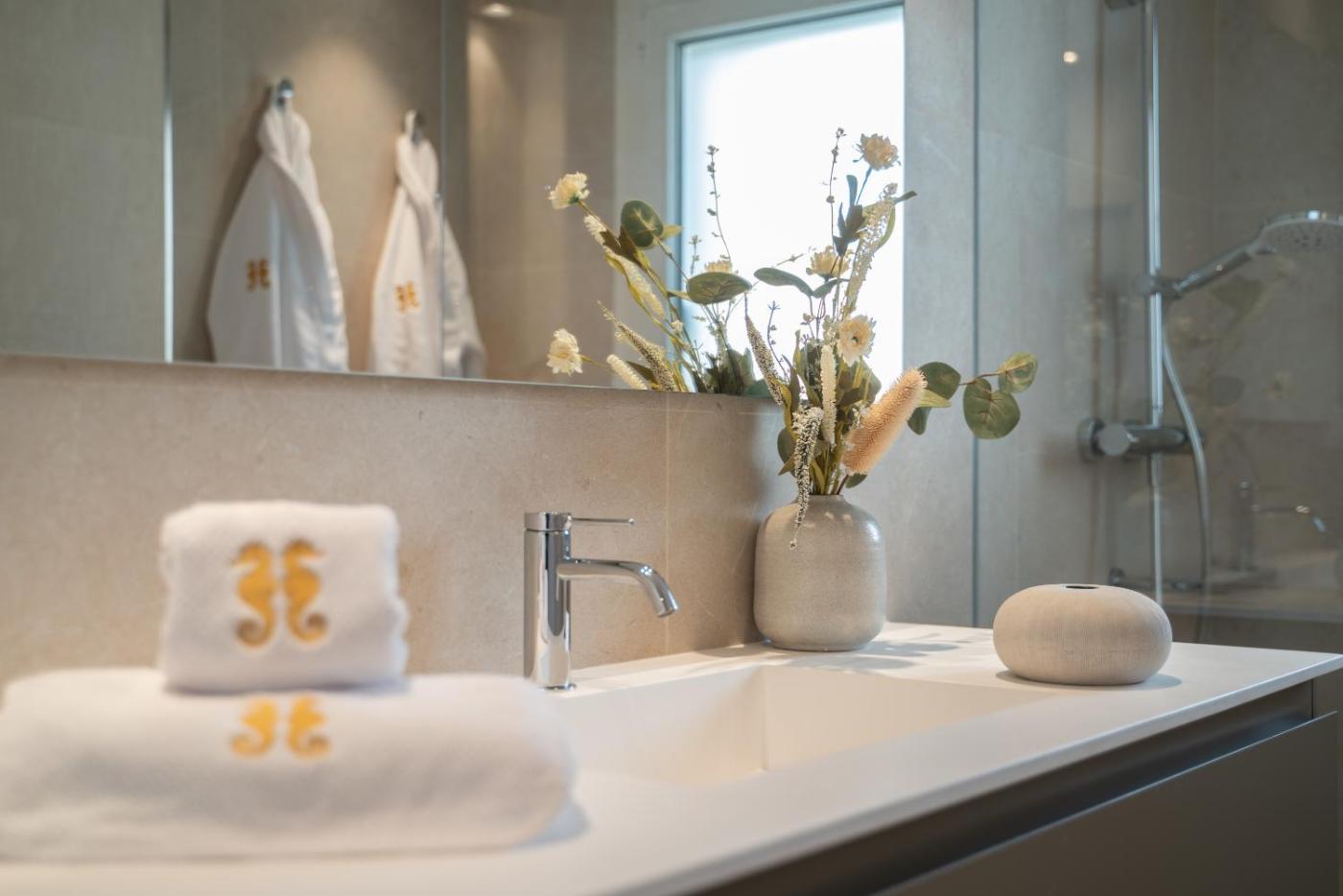 Two-Bedroom Apartment. This spacious apartment comes with 2 bedrooms, a kitchen and 2 bathrooms with a shower and a hairdryer. Meals can be prepared in the well-fitted kitchen, which features a stovetop, a refrigerator, a dishwasher and kitchenware. The air-conditioned apartment features a flat-screen TV, a washing machine, a tea and coffee maker, a dining area as well as sea views. The unit has 3 beds.